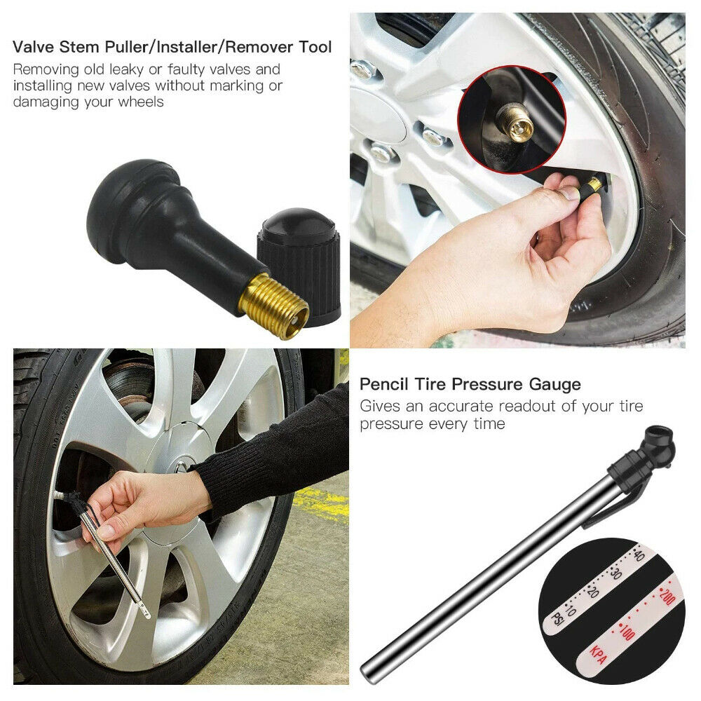 • ?Superior Quality’s Materials?Better than any other brand, our T-handle is made of the solidest A3 steel material which is stronger than others and not easy to break. The Tire Repair Strip is used the best rubber which is durable and not easy to age and harden. And this kit also equips the Tire Pressure Gauges with the Black Rubber Valve Stem which can measure and maintain the air pressure level of the tire after tire repairing work to ensure the safety of driving.