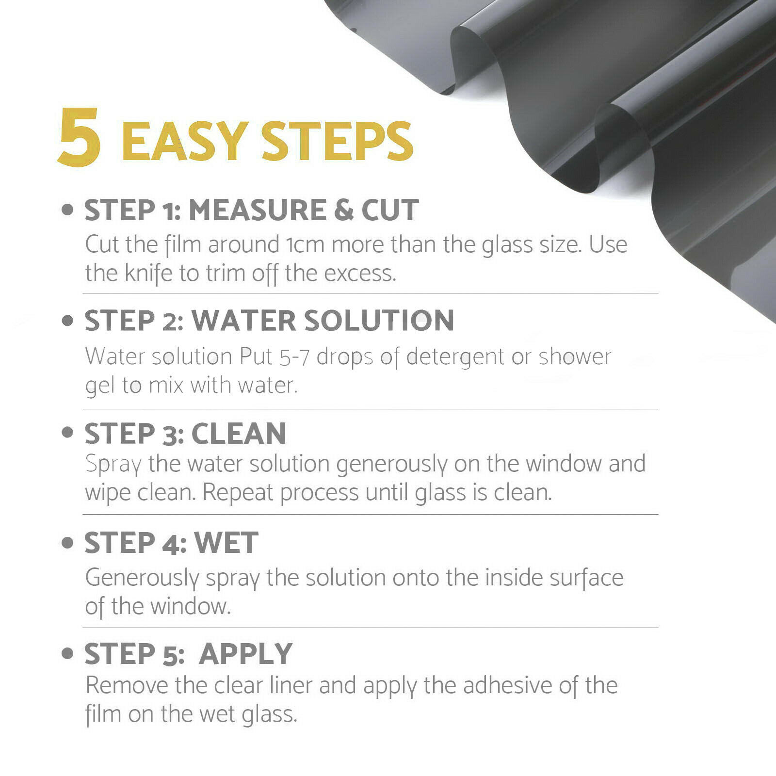 • 1 x 5% VLT Window Tint Film (wrapped in a hard paper tube)