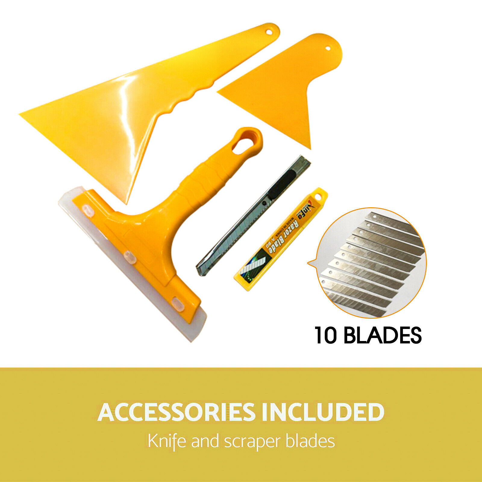 This Film Tool is for Auto/ Car film tinting squeegee application. It is designed to remove the soapy water from behind the film when installing. It comes with 4 different tools and additional 10 more blades, all of them are made of durable material, can be quite reliable and helpful; each item in the kit has a specific use and all are important to achieve a good finish, if you use a lesser quality squeegee you won?t get all the soapy water out from behind the film and this will cause your film to bubble.